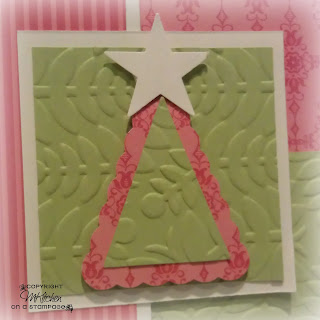 This is the classic one. Right? I used some gorgeous patterned papers, a dry embossed frame, and a fabulous Bo Bunny Santa image for this card. I LOVE the way the Santa image came out! I'd like to enter this one into the Jingle Belles: Embossing challenge. :)