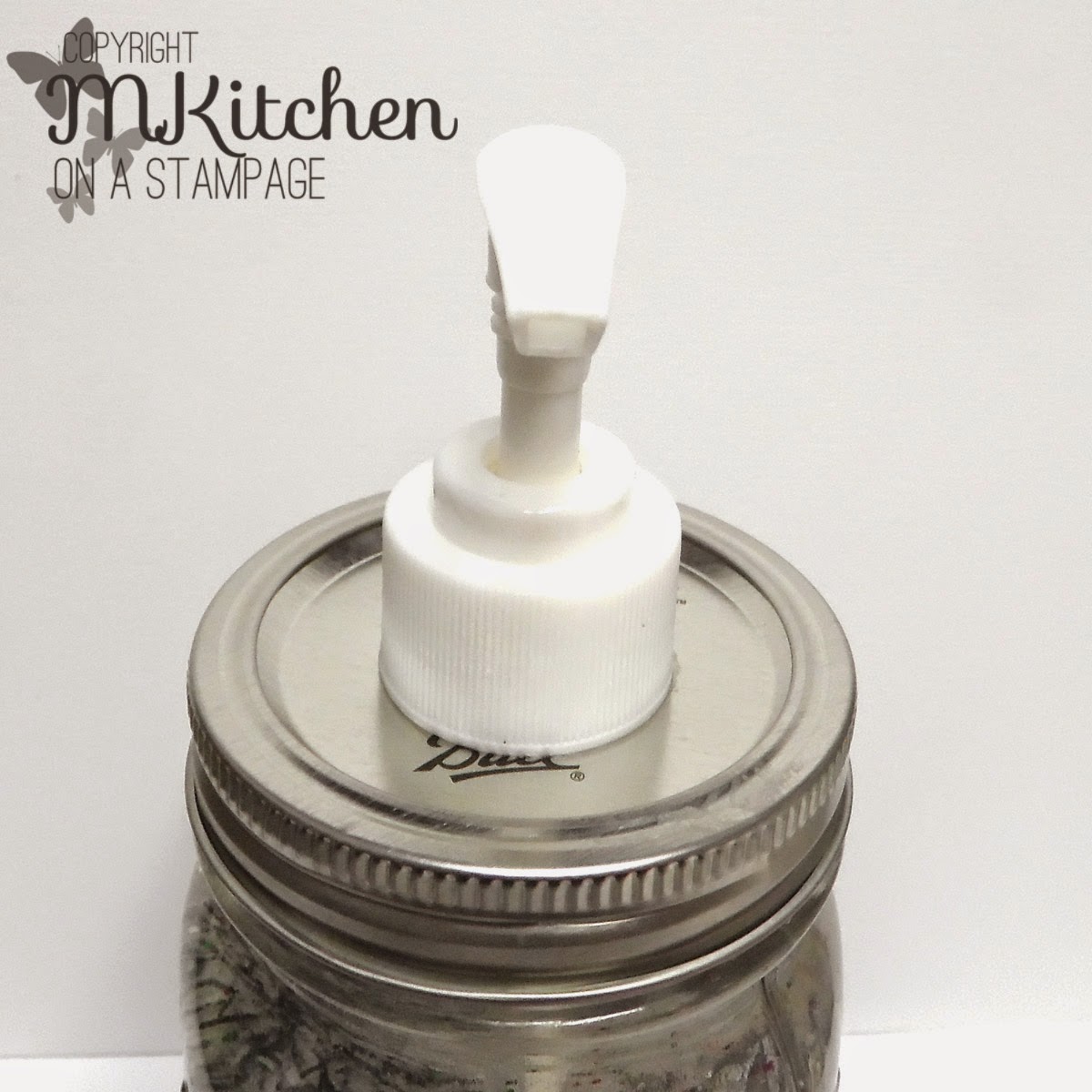 How fun and festive is that?! And they are really easy to make. At first I was thinking that it would take a long time to finish this project, but it took about 10 minutes. And 7 of that is stirring. I'll explain. The first thing you need to do is take a hammer and screwdriver and create a hole in the top of the jar for the soap pump to go through. This might mean hammering more than one hole into the lid. This is a two person job--one should hold the jar while the other hammers. The hole might not look pretty, but who cares?! It's gonna be covered up...if it wiggles, you can add super glue at the very end to keep it in place, but usually it's on there nicely!