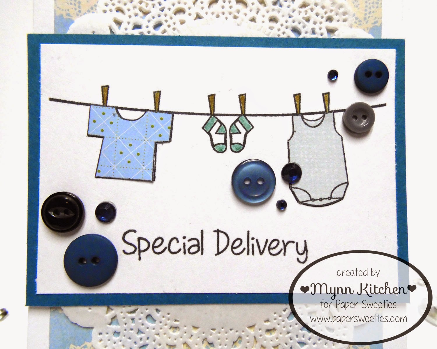 Love the sweet clothes on the washing line, Mynn!! The buttons look great and I love the doiley!!!!