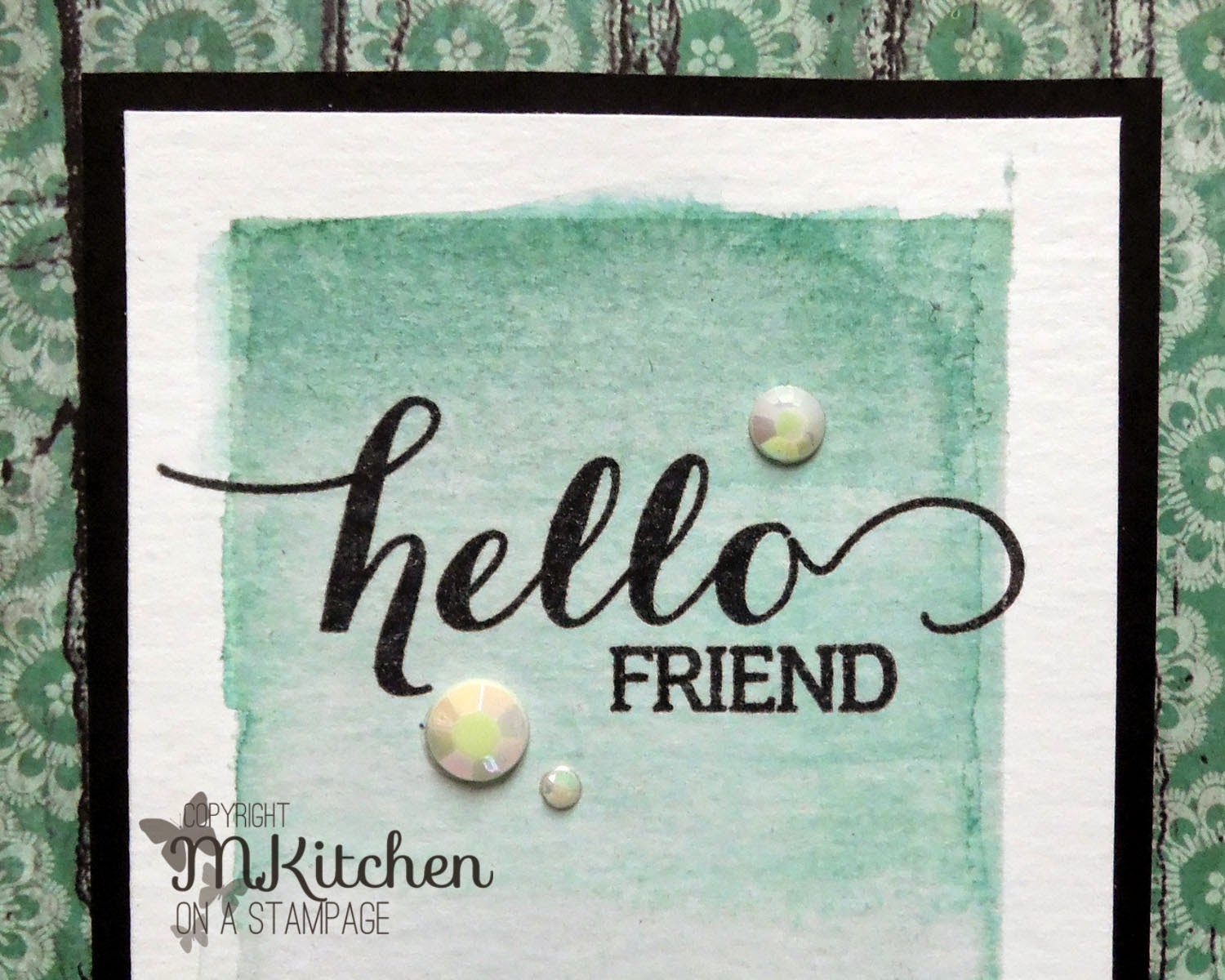 Lastly, I stamped a sentiment from the Big Hello stamp set from Inspired By Stamping with Memento Tuxedo Black ink and then added a few rhinestones from Want 2 Scrap to add shine and texture.
