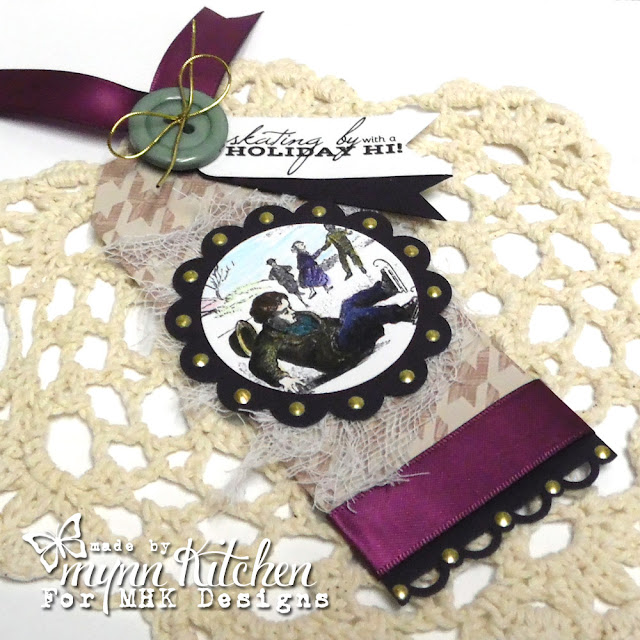 I made the tag base out of some paper from the Stenciled Roses Paper Pack. The image from the Skating By set was colored, then Master Fall-Down was punched out and layered. Some cheesecloth adds more texture behind this poor fellow.