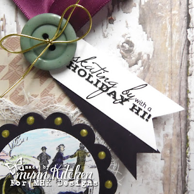 The sentiment was added to the top of the tag. I tied it onto some satin ribbon with gold elastic cording. A green button was added for a bit more color variety to match the image.