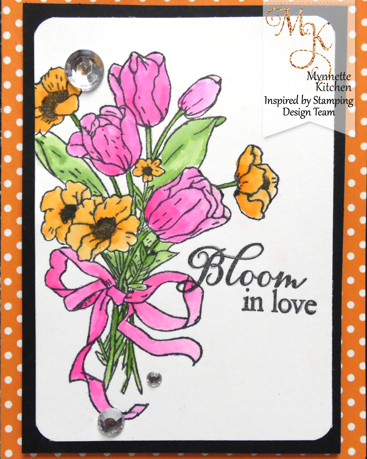 I started by stamping the beautiful image from the Tulip Bouquet acrylic stamp set onto white cardstock with Memento Tuxedo Black ink. I watercolored the image with bright spring colors, then added a sentiment from the same set. I traced over the sentiment with a glitter gel pen for some sparkle, and added rhinestones for a bit more shine and finish.