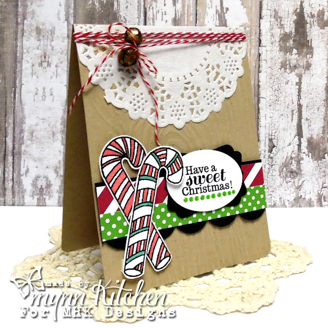 Such a SWEET christmas card, Mynn!!!! Love the fun doily, jingle bells and twine and of cause, the polka dots, stripes and cute candies, too - all on a lovely kraft base!!!! Wonderfully done, my friend!!!
