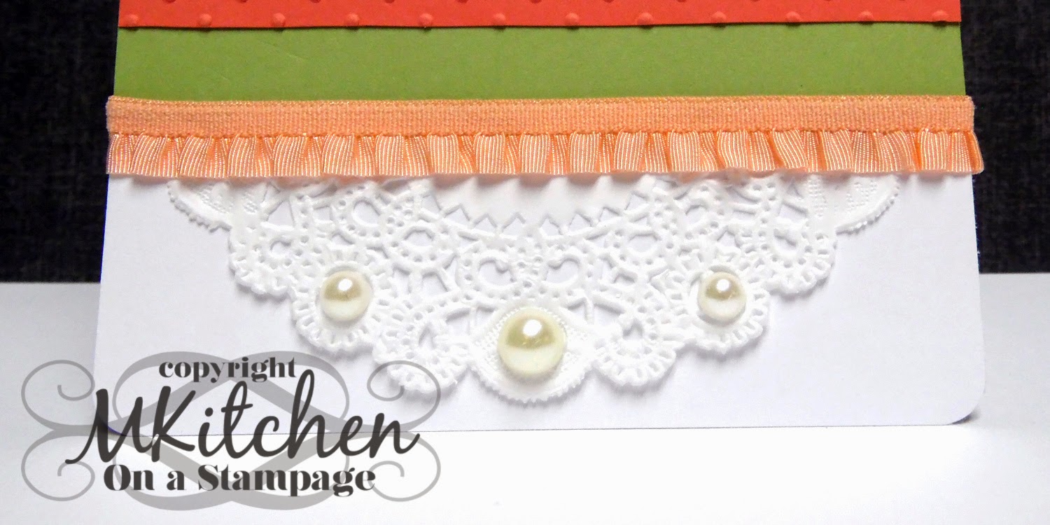 I've used stamps from Inspired By Stamping, a doily by Wilton, pearls from Want 2 Scrap, a dry embossing folder by Sizzix, black ink by Memento, and all other supplies are by Stampin' Up!