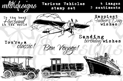 I did some sponging to create a scene for the truck image from the *NEW* Various Vehicles digital stamp set.  It added just the right amount of color and texture--I love it!  I kept the sentiment on the same panel to make things even easier--men don't usually like a lot of fuss. ;)